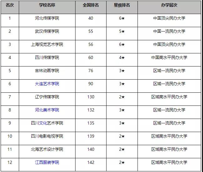 河北傳媒學院、武漢傳媒學院、上海視覺藝術學院、四川傳媒學院、吉林動畫學院名列校友會2020中國藝術類民辦大學排名前5名。中國傳媒大學南廣學院、北京電影學院現(xiàn)代創(chuàng)意媒體學院、云南藝術學院文華學院名列校友會2020中國藝術類獨立學院排名前5強。