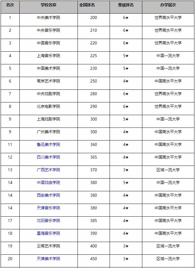 中央戲劇學院、北京電影學院、中國音樂學院、中央美術學院、中央音樂學院等榮膺2020中國六星級大學(6★)美譽,躋身世界高水平大學、中國頂尖大學行列。